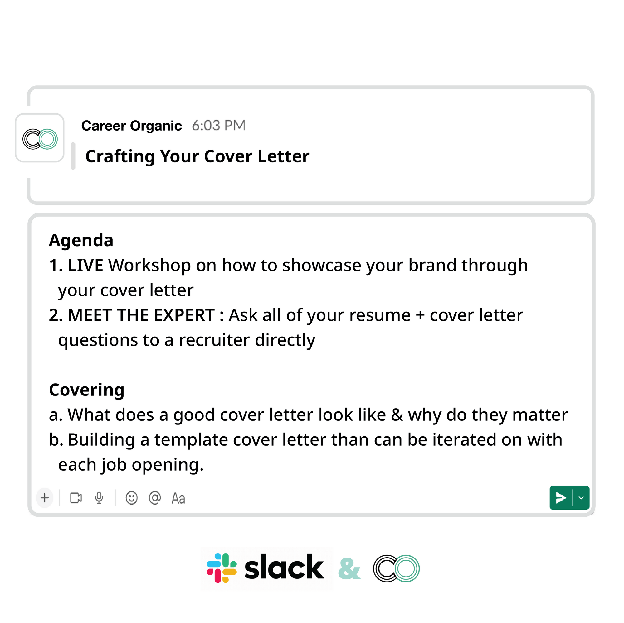 Looking for a job can be tough. There are so many variables to consider - where to look, what to apply for, what to say in an interview. It can be overwhelming. That's why we've created a weekly support channel to walk you through each step of the process at a budget-friendly price of $45/month.